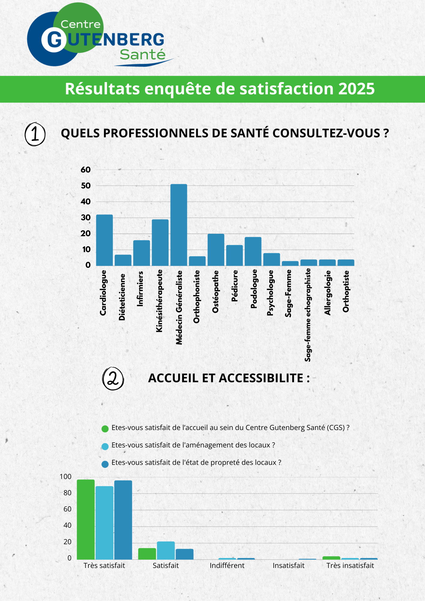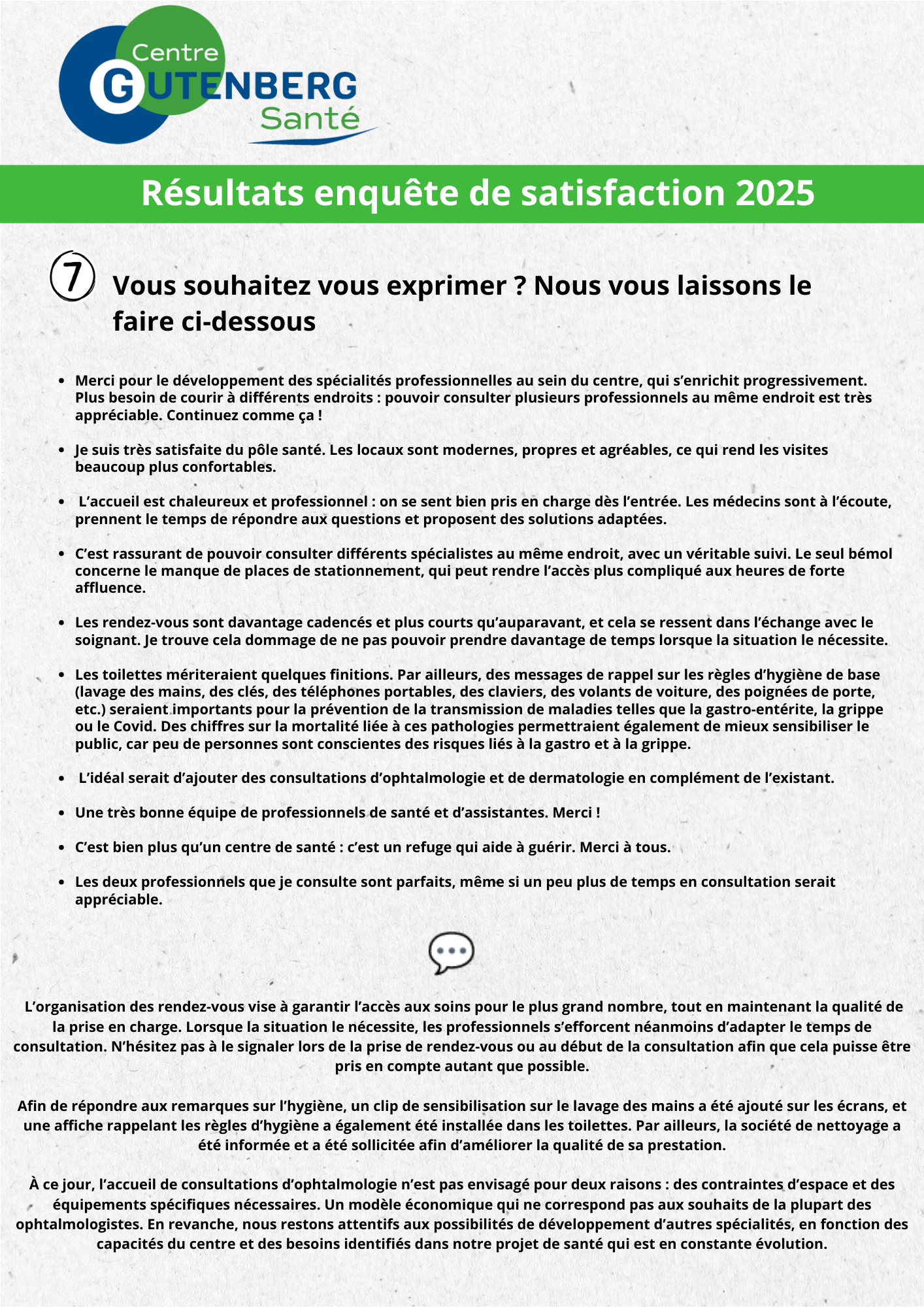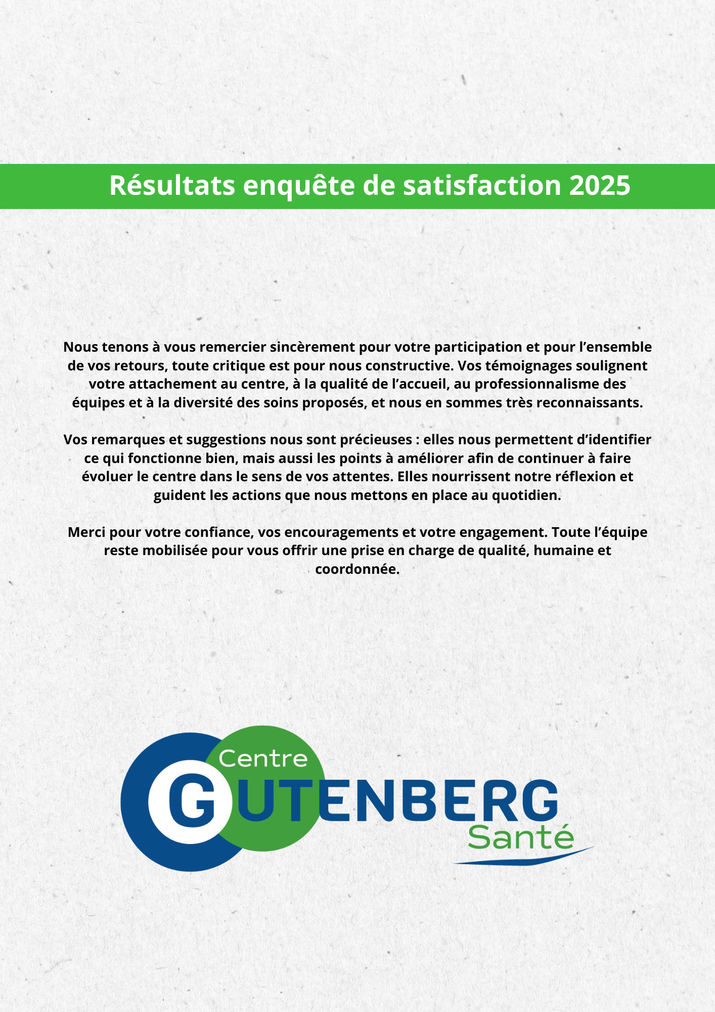 Cette enquête nous a permis de mieux comprendre votre expérience au sein du Centre Gutenberg Santé : ce que vous appréciez, ce qui pourrait être amélioré, et vos idées pour rendre vos visites encore plus faciles et agréables.