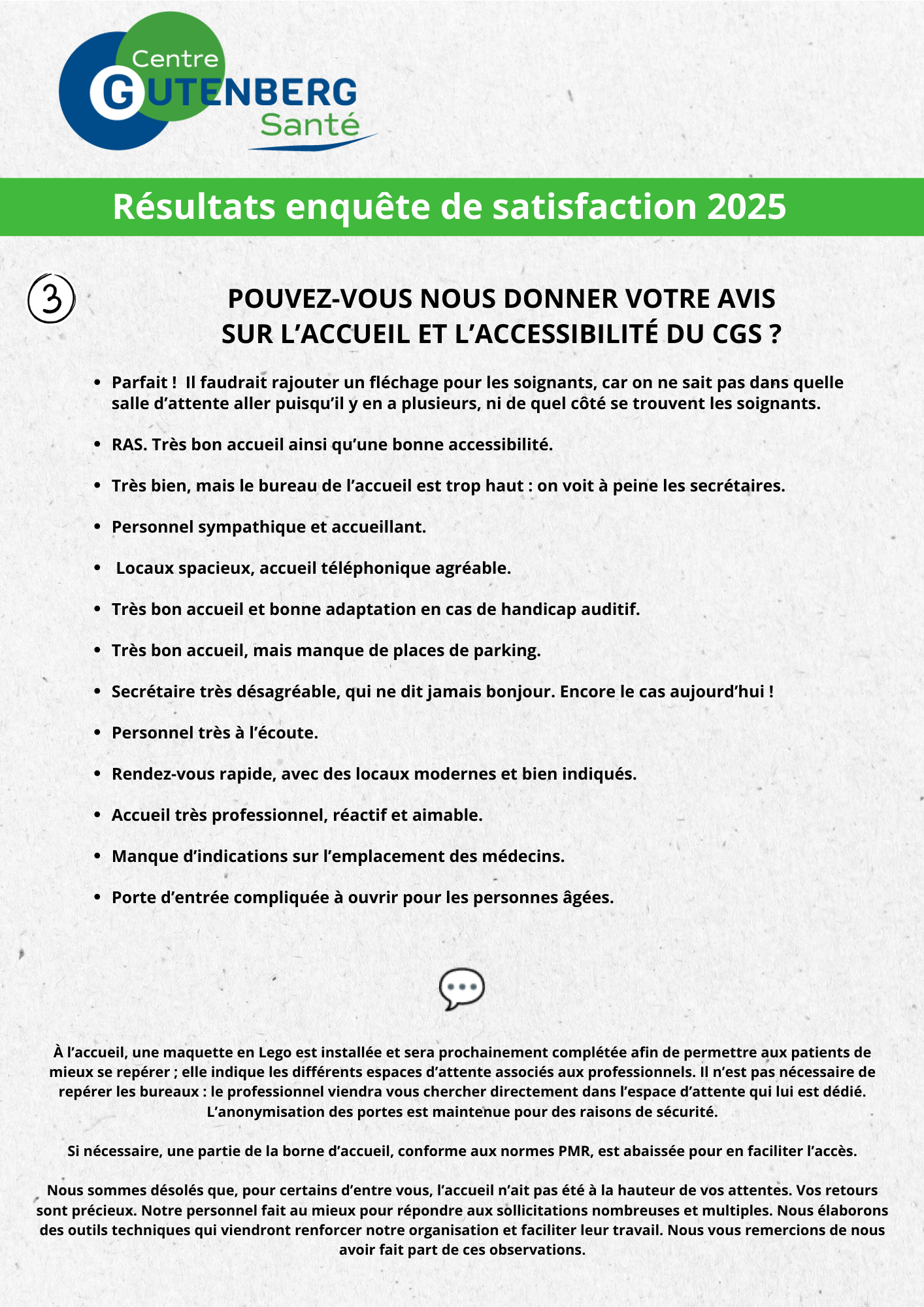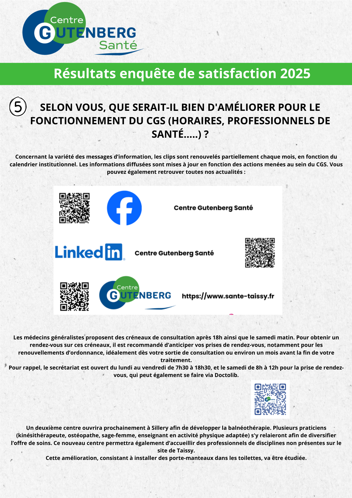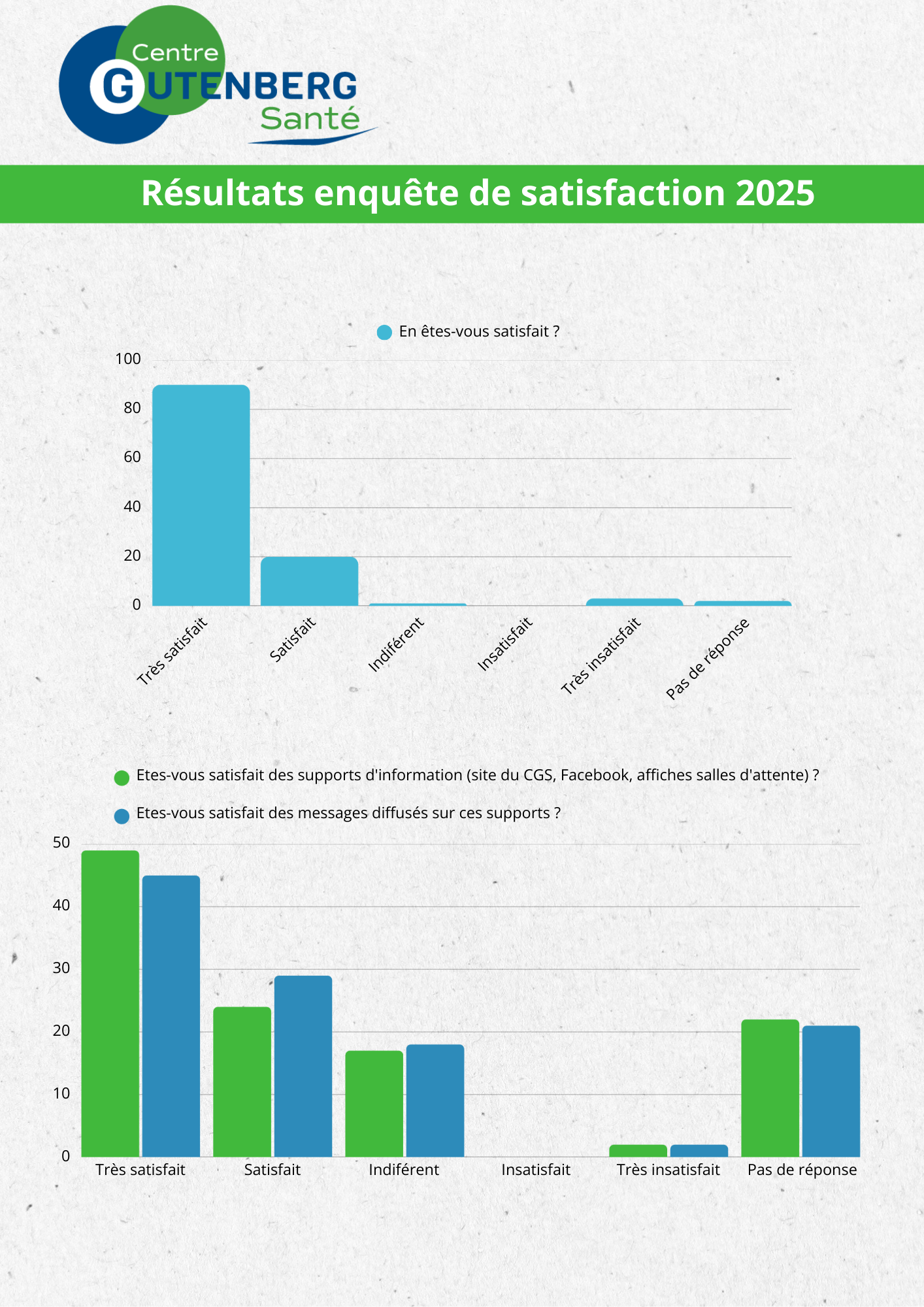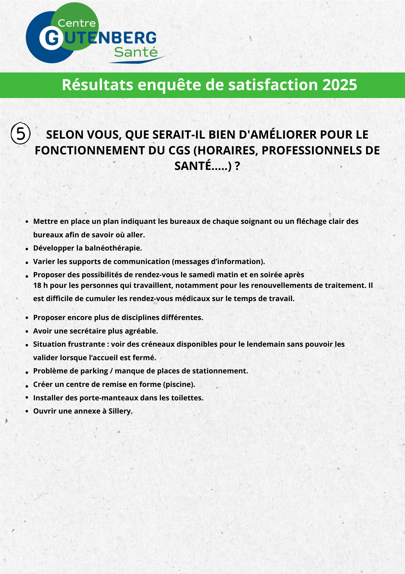 Cette enquête nous a permis de mieux comprendre votre expérience au sein du Centre Gutenberg Santé : ce que vous appréciez, ce qui pourrait être amélioré, et vos idées pour rendre vos visites encore plus faciles et agréables.
